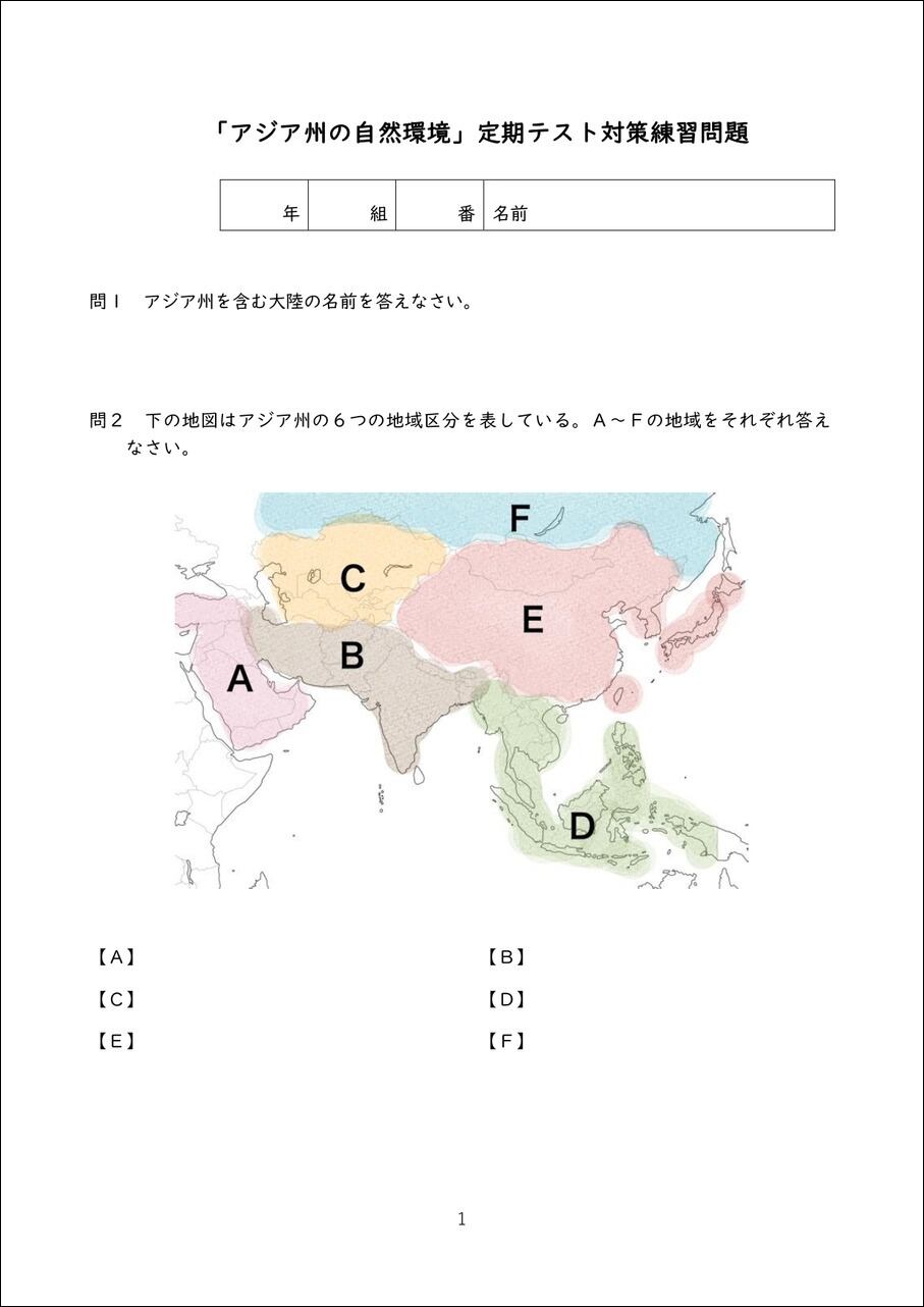 中学1年の社会で学習する「アジア州の自然環境」の定期テストで出題されやすい問題をまとめたオリジナル練習問題プリントのデータです。