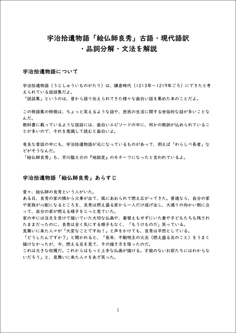 高校古典で学習する宇治拾遺物語の「絵仏師良秀」について、話のあらすじや内容、古語の意味、原文と現代語訳、品詞分解、そして使われている文法のポイントをわかりやすく解説しているオリジナルプリントデータです。