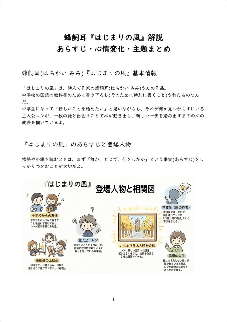 中学校1年生の国語で学習する蜂飼耳『はじまりの風』から、お話のあらすじ、おさえるべき内容、使われている表現技法や言葉の意味、登場人物の心情の変化など、大切なポイントを解説しているオリジナルプリントのデータです。