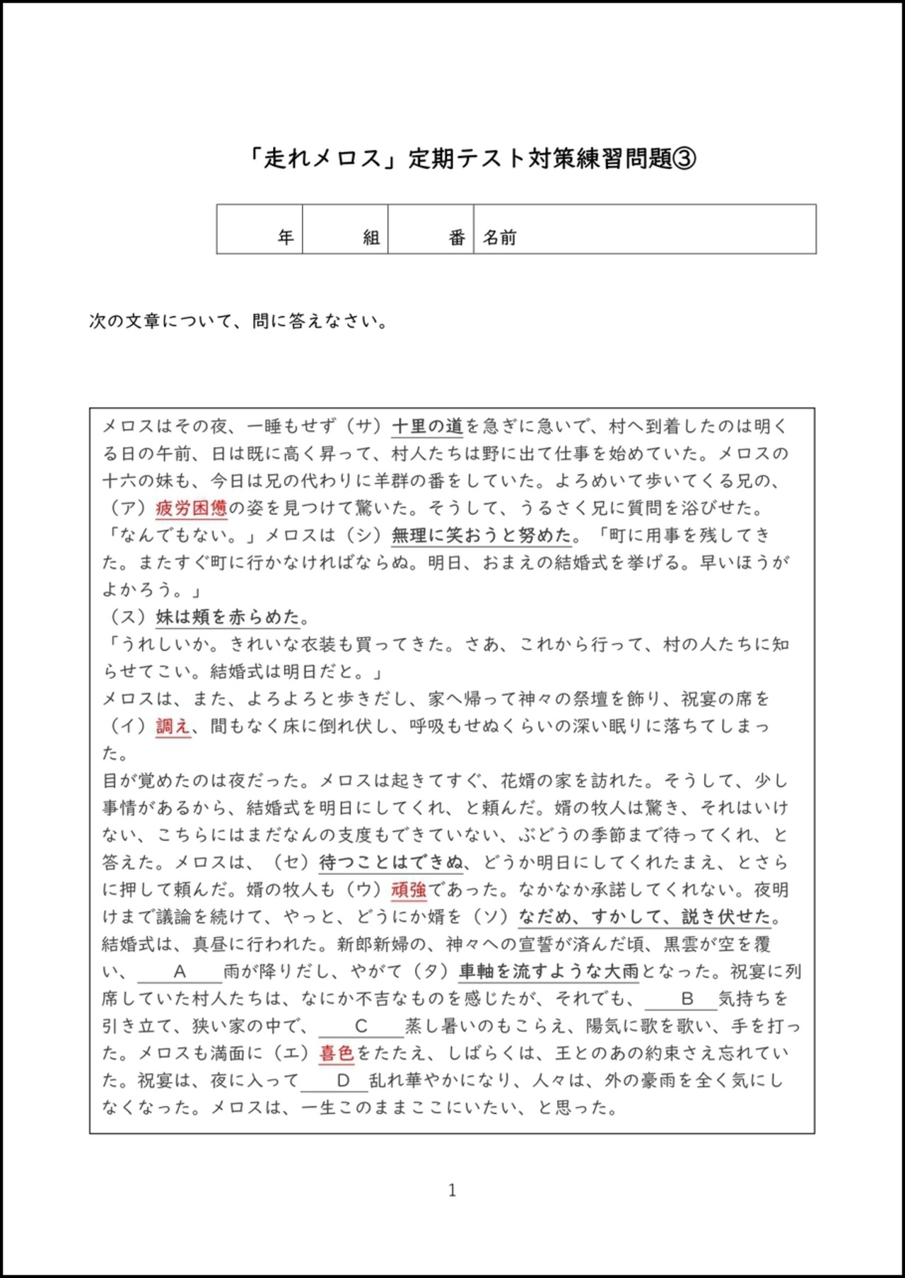 中学2年の国語で学習する太宰治の「走れメロス」で出題されやすい問題をまとめたオリジナル練習問題プリントのデータです。