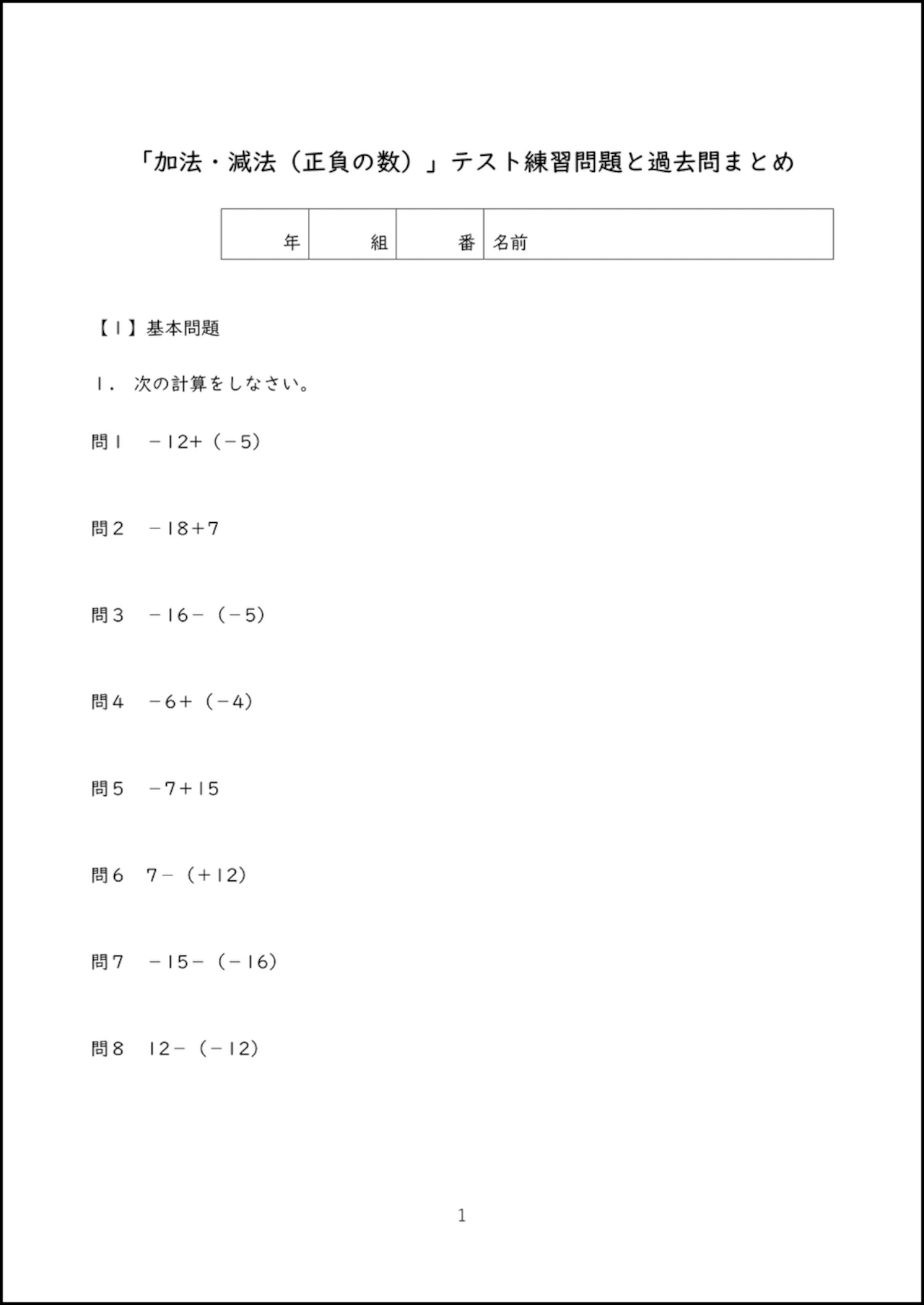 中学1年生の数学「加法・減法(正負の数)」で出題されやすい問題をまとめたオリジナル練習問題プリントのデータです。