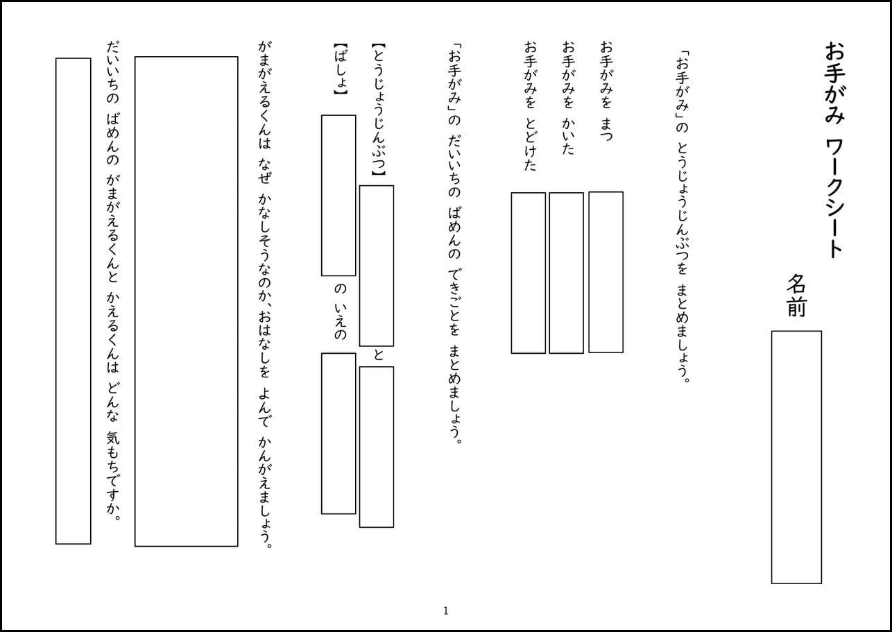 小学校1年生の国語で学習する「お手紙」について、ポイントを理解するのに役立つオリジナルワークシートのプリントデータです。