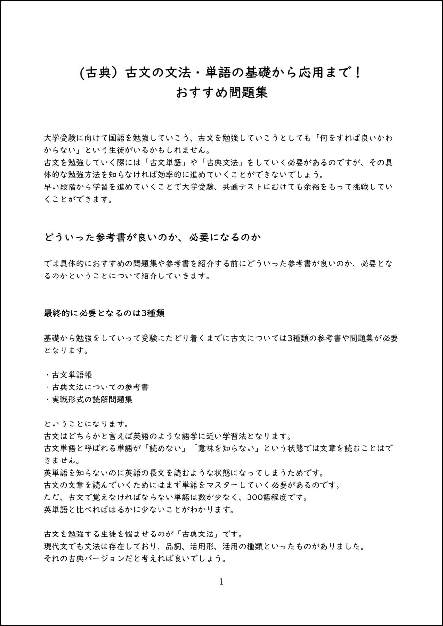 高校で学習する古典で必要となる「文法」と「単語」の基礎から応用まで効率的に学べるおすすめの問題集を紹介しているオリジナルプリントのデータです。