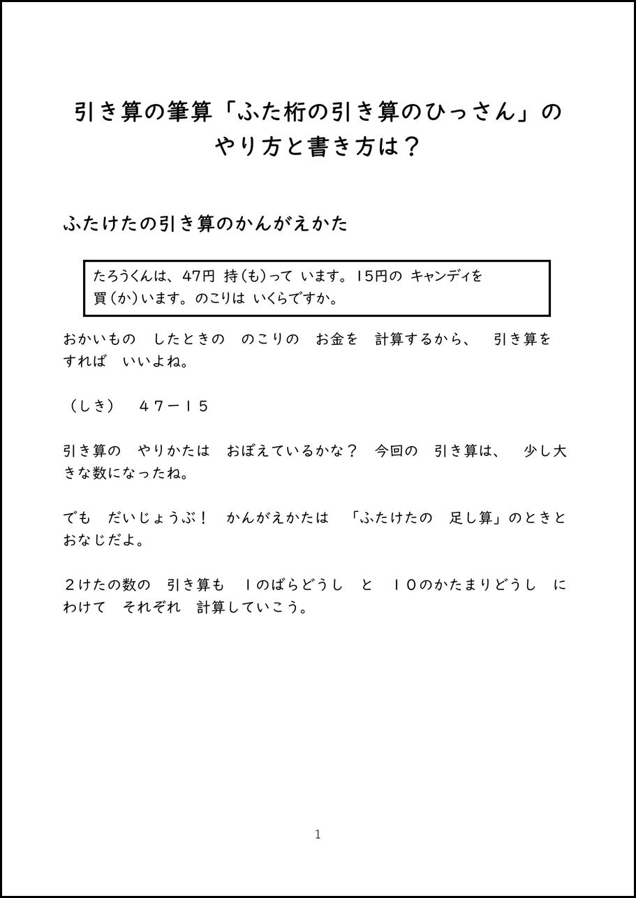 小学2年生の算数で学習する、「ふたけたの引き算の筆算(ひっさん)」についてわかりやすく解説しているオリジナルプリントのデータです。