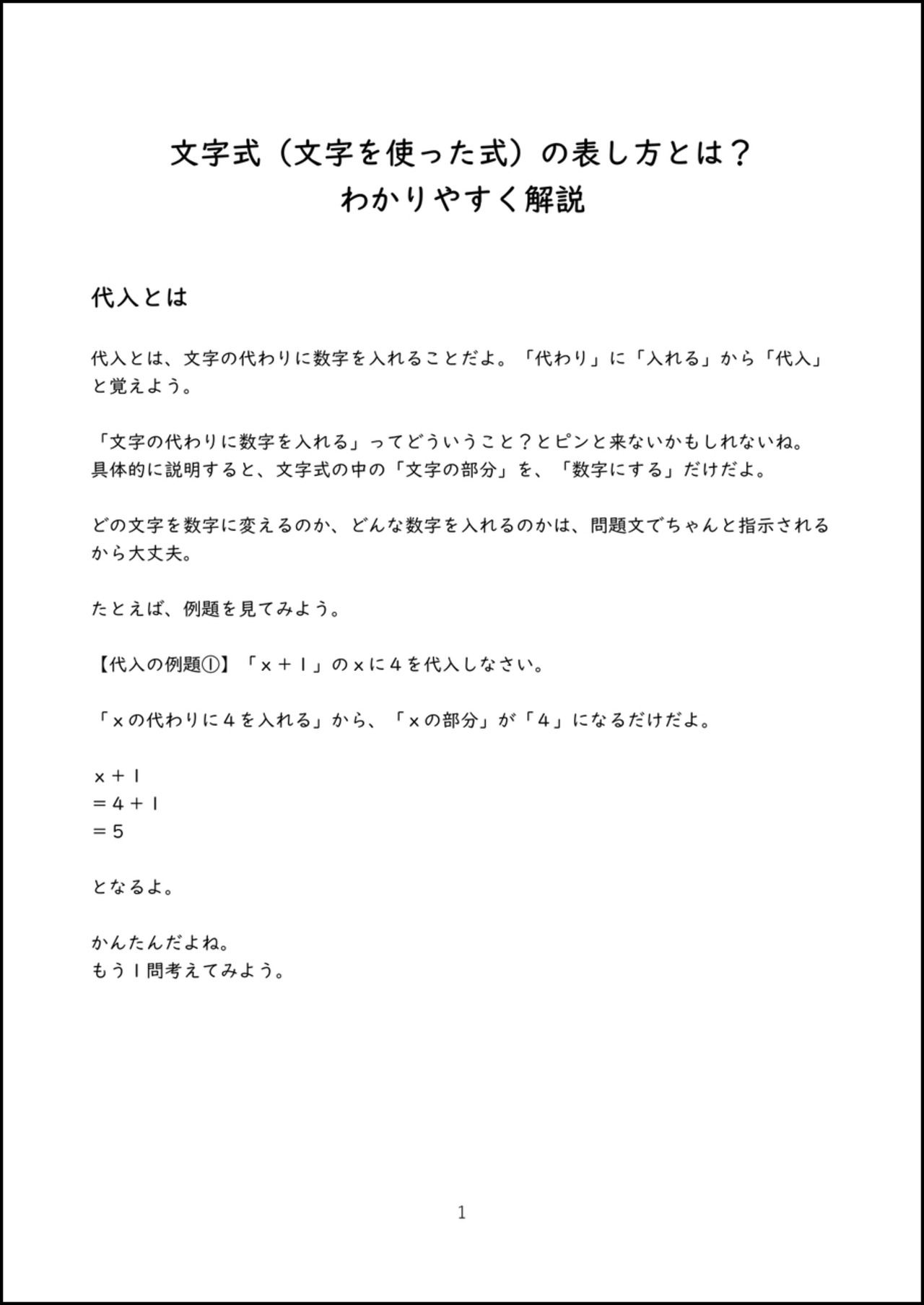 中学1年生の数学で学習する、式の代入と式の値について、代入の方法とポイントをわかりやすくまとめているオリジナルプリントのデータです。