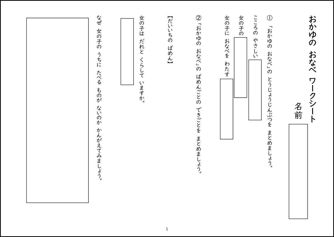 小学校1年生の国語で学習する「おかゆのおなべ」について、ポイントを理解するのに役立つオリジナルワークシートのプリントデータです。