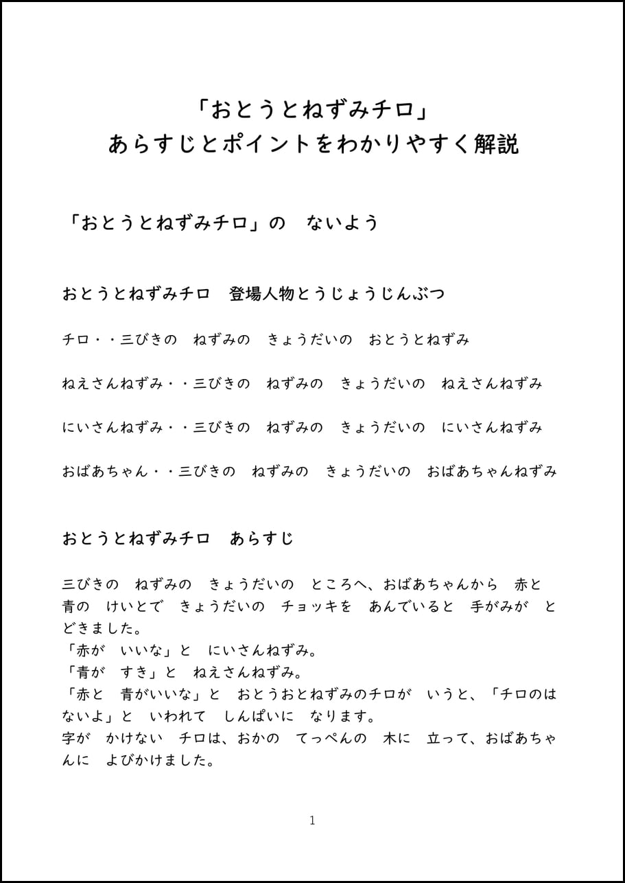 小学校1年生の国語で学習する「おとうとねずみチロ」について、あらすじとポイントをわかりやすく解説しているオリジナルプリントのデータです。