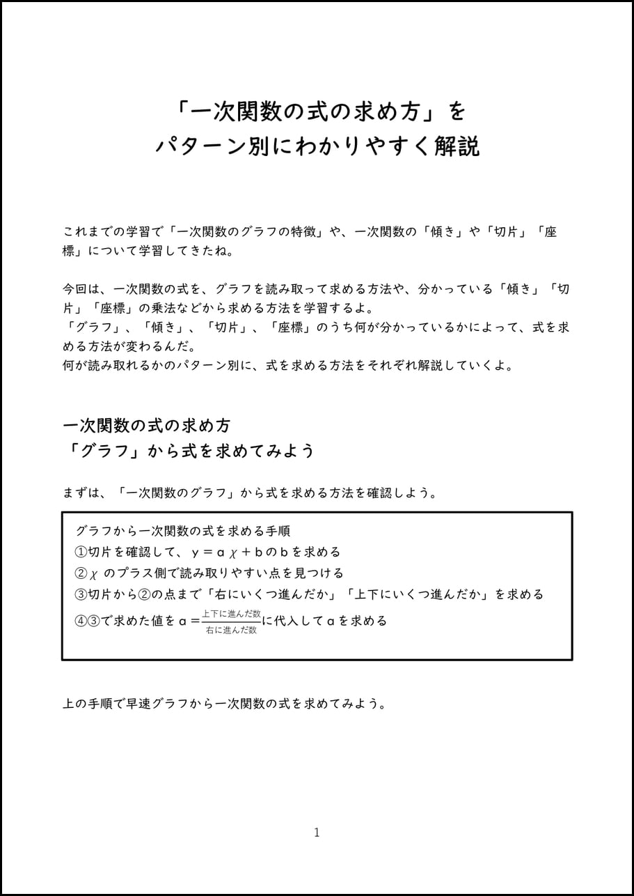 中学1年生の数学で学習する、「一次関数の式の求め方」ついてパターン別にポイントを解説しているオリジナルプリントのデータです。