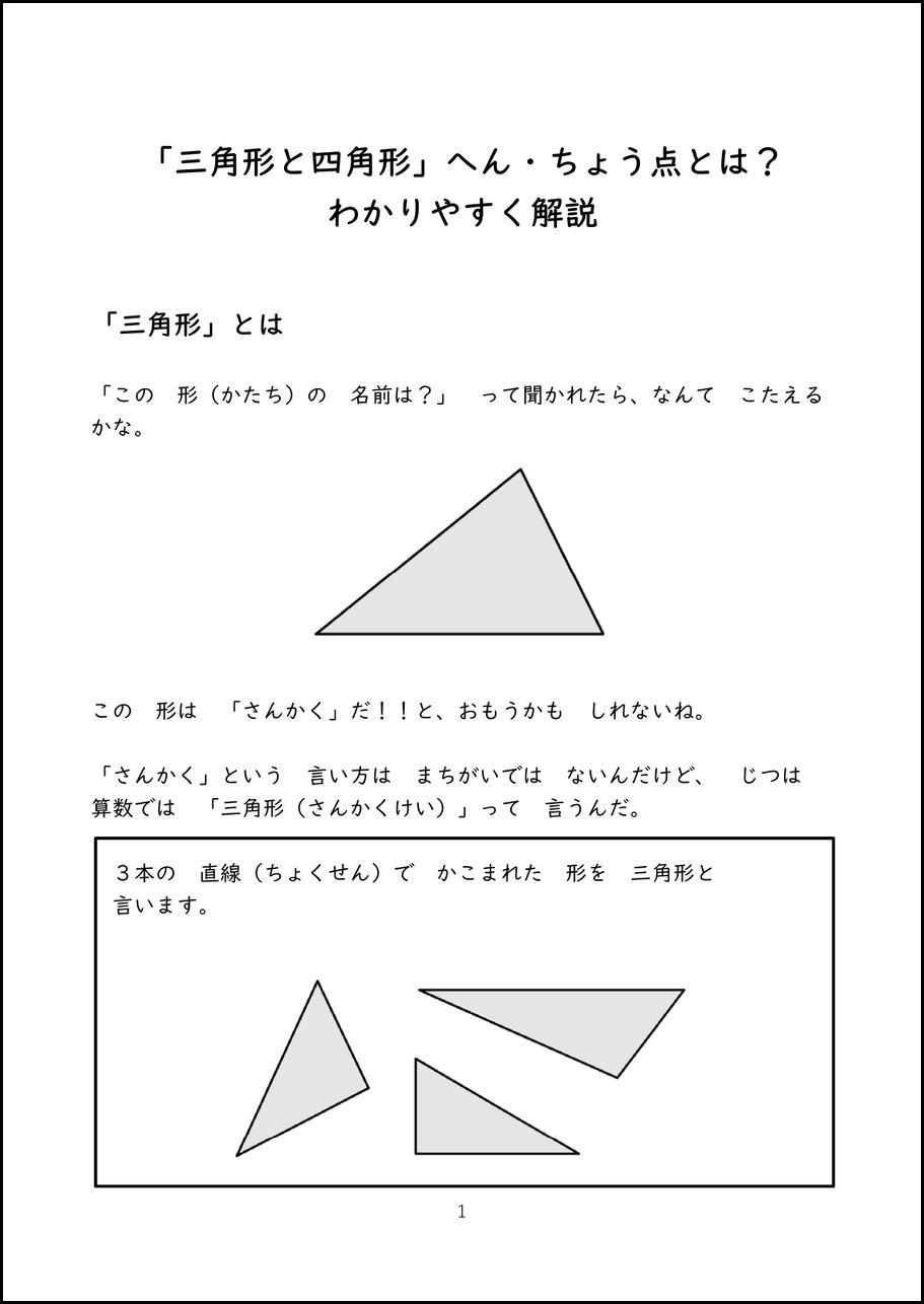小学2年生の算数で学習する、「三角形と四角形」について、わかりやすく解説しているオリジナルプリントのデータです。