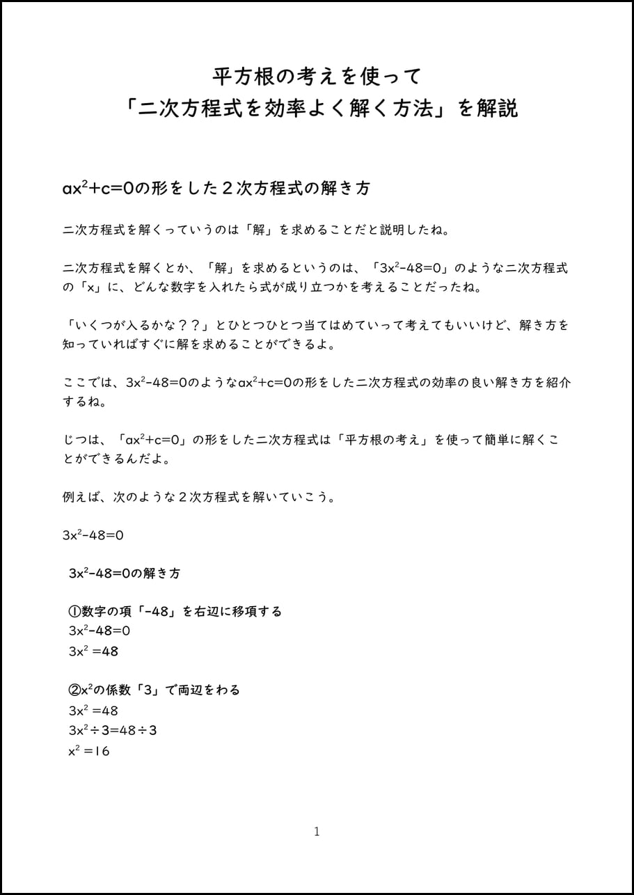 中学校3年生の数学で学習する、平方根の考えを使って 「二次方程式を効率よく解く方法」をわかりやすく解説しているオリジナルプリントのデータです。
