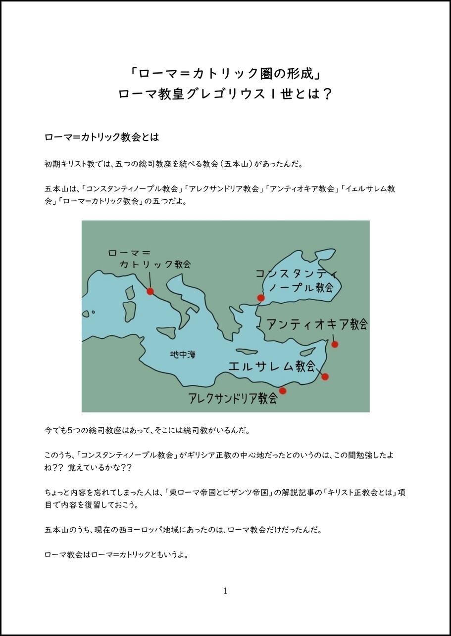 高校世界史で学習する「ローマ=カトリック圏の形成」 ローマ教皇グレゴリウス1世についてわかりやすく解説しているオリジナルプリントのデータです。