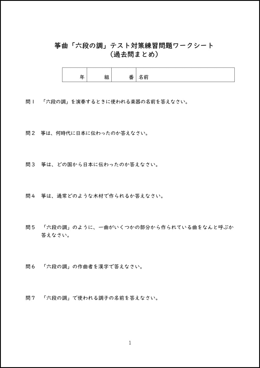 中学の音楽で学習する筝曲「六段の調」の定期テストで出題されやすい問題をまとめたオリジナル練習問題プリントのデータです。