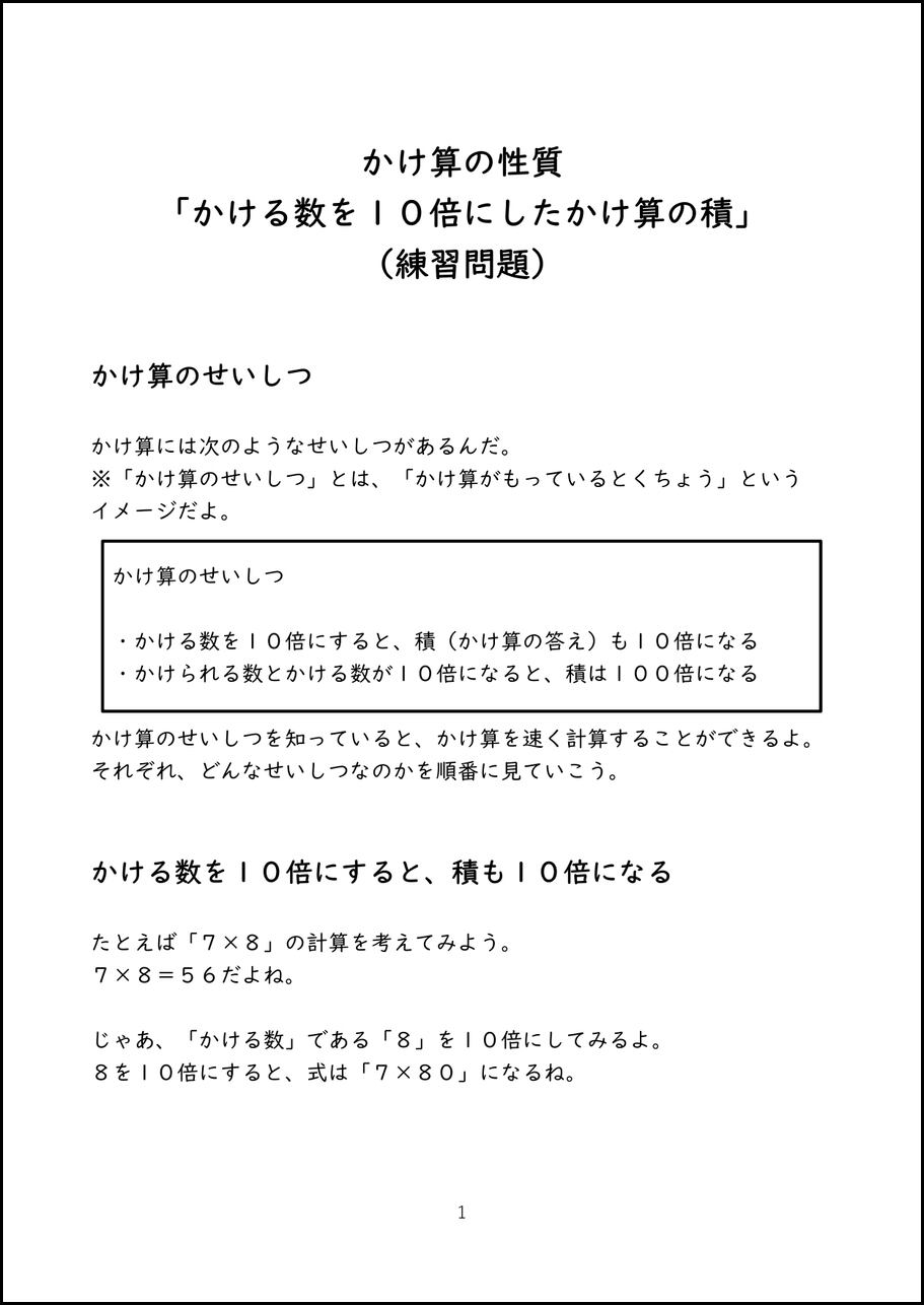 小学校4年生の算数で学習する「かけ算の性質」について、「かける数を10倍にしたかけ算の積」 「かけられる数とかける数が10倍になったかけ算の積」についてわかりやすく解説しているオリジナルプリントのデータです。