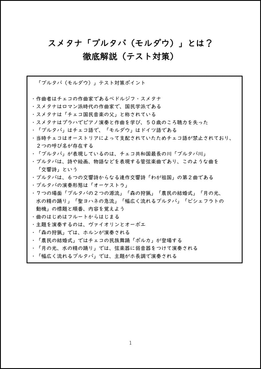 中学校3年生の音楽で学習するスメタナ作曲「ブルタバ(モルダウ)」について、テスト対策ポイントである作曲者のスメタナについて、ブルタバの意味や交響詩について、演奏形態、使われる楽器、それぞれの場面(情景)の意味と特徴をわかりやすく解説しているオリジナルプリントのデータです。